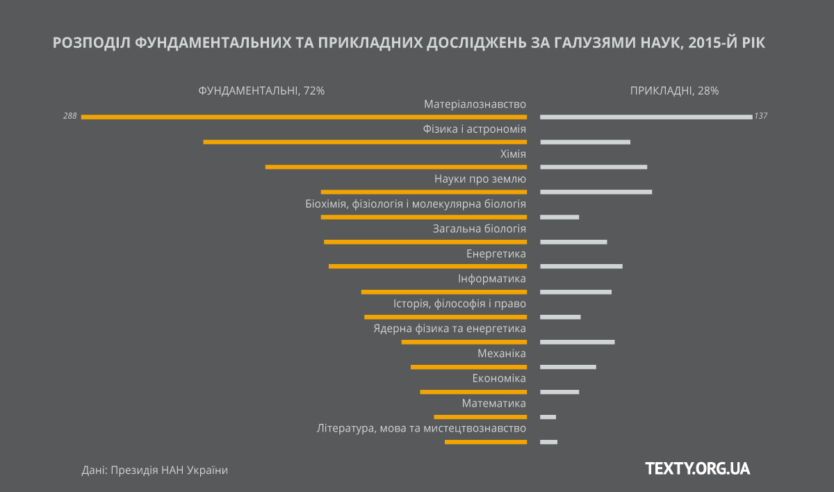 Попри катастрофічний брак коштів, в НАНУ ситуація дзеркально протилежна – тут вчені чомусь в основному зайняті роботою над фундаментальними дослідженнями. Наприклад, у 2015-му році лише 28 із 100 досліджень Академії, які фінансувалися державою – мали прикладний характер.