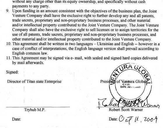 «Я знайшов інвестора з США — Ventura Global Corporation. Він дав контракт на 50 мільйонів доларів: 3 мільйони був готовий дати одразу і без плану, а решту грошей — 47 мільйонів — по бізнес плану. І розрахунок трубами. Підписати контракт треба було за півтора місяці. Але у тодішнього директора Заводу спеціальної електрометалургії Миколи Тригуба був тоді рак простати. І йому цей проект був не цікавий. Я приходжу до Патона зі словами «Це найбільша інвестиція в Академію наук Україні». А він мені: «Та я в цьому не розуміюсь!». І контракт не підписали! Бо спеціальність в академії — витрачати кошти. Освоювати бюджет, а не заробляти».