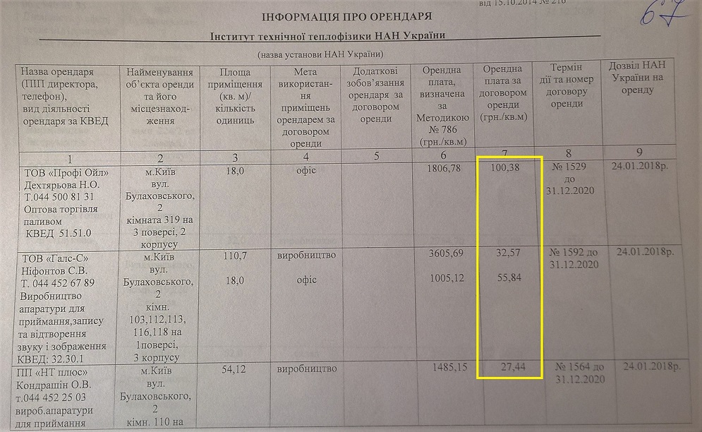Наприклад, у Святошинському районі міста Києва оренда одного квадратного метру комерційної нерухомості коливається від 100 до 300 гривень. В той же час, наприклад, в Інституті технічної теплофізики (який знаходиться у цьому ж районі) здаються в оренду площі за ціною 27-100 грн. за квадрат. Ще більший розрив у цінах – у центральних районах столиці, де знаходиться чимало установ Академії. Та черг у приймальнях директорів установ НАНУ як не було, так і нема досі.