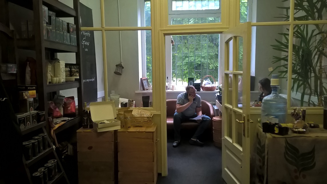 Компанія із оптового продажу кави орендує чотири кімнати із видом на невеличку паркову зону на першому поверсі Інституту загальної та неорганічної хімії ім. В.І. Вернадського. Поки я оцінюю стильний дизайн приміщення в коричневих тонах, молодий директор Сергій, схилившись над прайсом, обговорює з кимось по телефону покупку капучинатора.